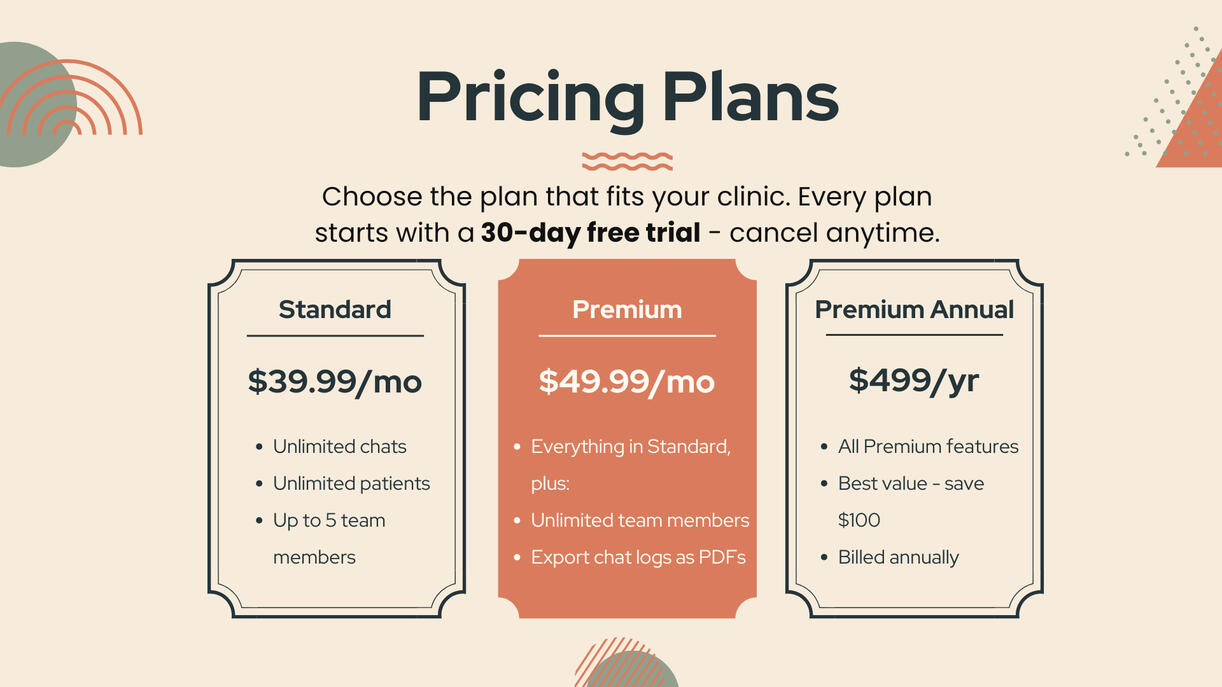 Yes. Clinics can invite multiple staff members to view or manage chats. Access is controlled by admin users.How much does it cost?